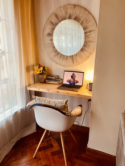 An old, abandoned entryway nook is transformed into a simple, sophisticated minimalist workstation.